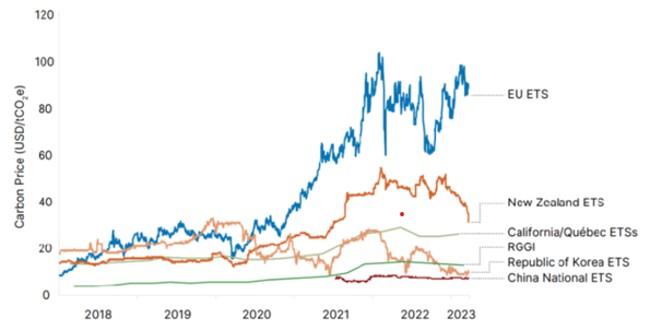 ETS fiyatları daha şeffaf olup çeşitli portallarda yayınlanmaktadır. Şimdiye kadar en yüksek ETS fiyatı 97.5 euro/tCO2 eş değeri ile 2022’de oluşmuştur. Dünya Bankasının 2023 raporuna göre belli başlı piyasalardaki fiyat trendi Şekil’de görülebilir.